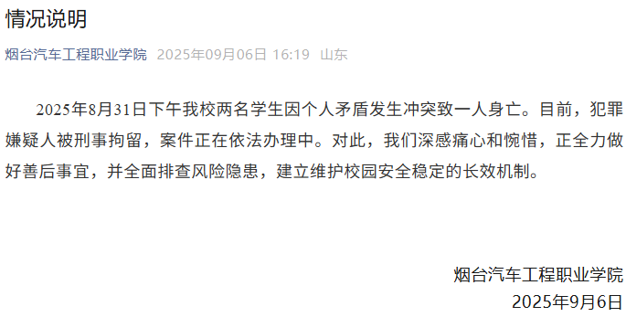 9月5日,一位内部人士的记者得知,8月31日,Yuan Moumou是Yantai Automobile Engineering职业学院的19岁大二学生男孩,在学校的宿舍中遭受了锋利的武器,后来死亡,后来死亡。熟悉此事的人说,嫌疑人是死者的同学,并由警察控制。 9月4日,扬泰市政公共安全局福山分公司发出的“身份意见通知”显示,元穆莫在他的生活中用锋利的武器刺伤了胸部,造成肺部和严重的失血。 9月6日下午,Yantai Automobile Engineering职业学院发表声明说,8月31日下午,由于MGA个人冲突而造成冲突,两名学生被杀。目前,犯罪嫌疑人仅限于罪犯,案件是根据法律处理的。根据Yantai Automobile工程职业学院的典型网站成立于2006年,由Yantai Municipal人民政府赞助。这是山东省职业学院的一所高质量学院,也是一所受欢迎的学校,以在山东省培养经验丰富的人才。大学覆盖了1,000多公顷的面积,目前有800多名教师和教职员工以及22,000名学生。资料来源:综合Yantai Automobile工程职业学院,论文
