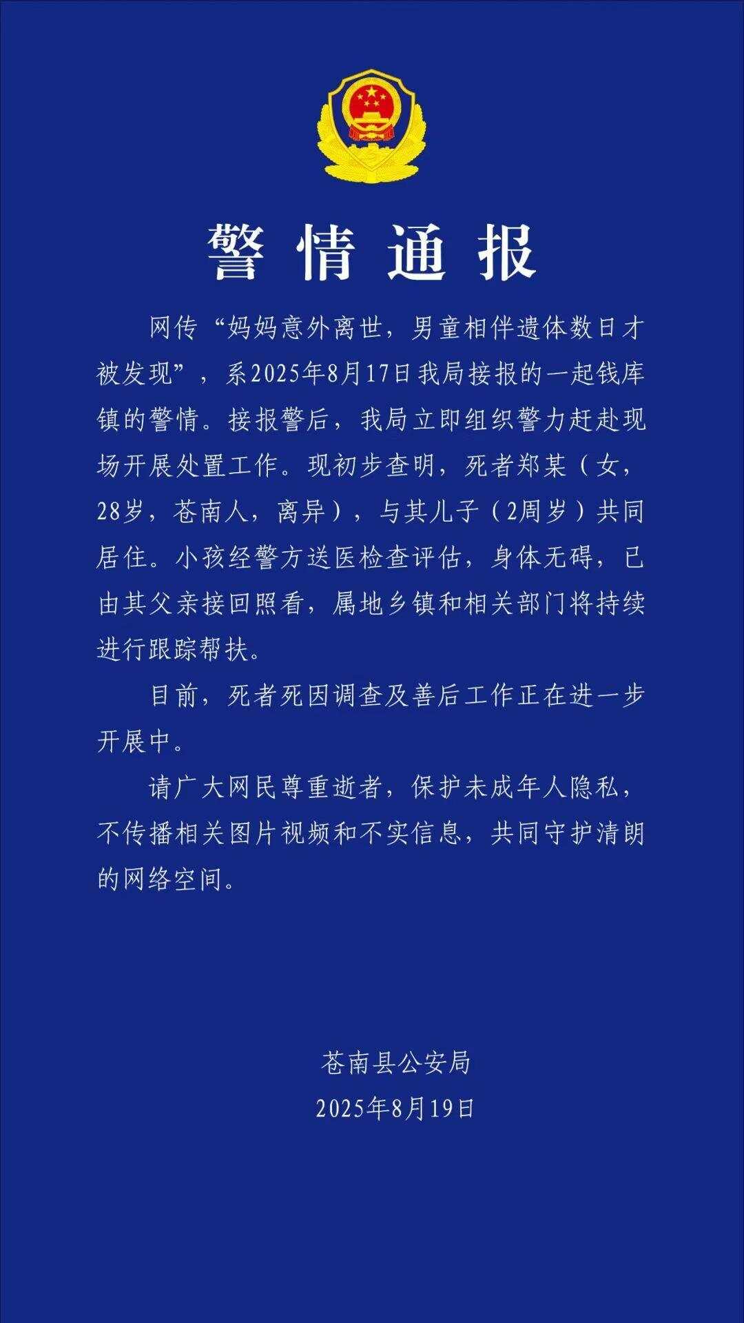 8月19日,惠江省温州坎尼汉县县县县县县发表了一份警方报告:“我的母亲意外死亡,发现一个男孩的尸体数天了。”这是我们局在2025年8月17日收到的Qianku镇的一份警察报告。收到警报后,我们的局立即安排了警察部队赶往现场进行工作。首先发现死者的郑(女性28岁,来自Cana,与儿子(2岁)生活在一起。该孩子被送往医院进行警察评估和评估。他身体健康,并由父亲康复。当地城镇和相关部门将继续跟上并提供帮助。目前,对死亡原因和死者的调查进行了调查。请尊重死者,保护未成年人的隐私,不传播相关的图像,视频和错误信息,并共存清晰清洁的网络空间。 (来源:ping a can非)